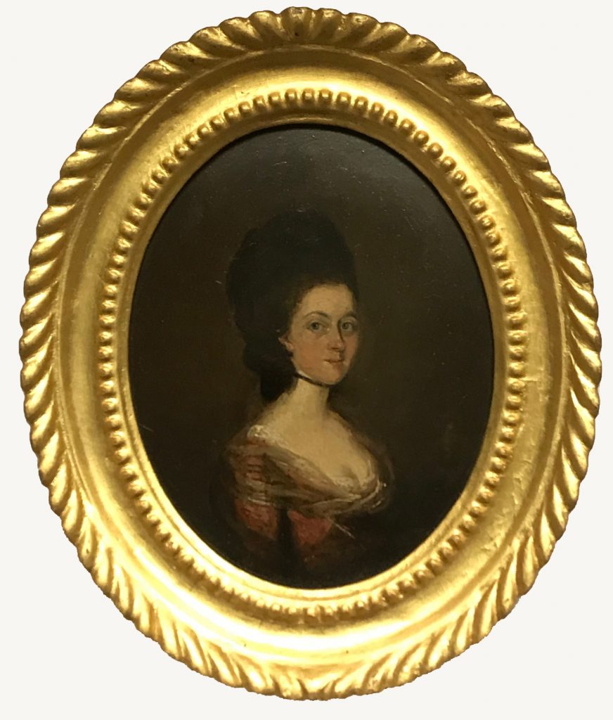 The portrait is painted in oil on convex metal, probably tin, and is set in a gilt wood frame with a piecrust edge and inner beaded border. The portrait has minor spots of in-painting to the background but is otherwise fine. The frame has been re-gilded so is rather shiny.