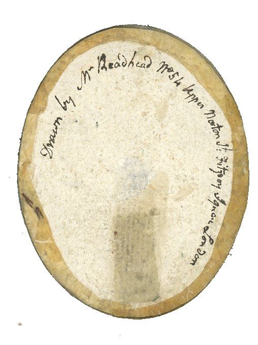 His profiles are reverse painted on convex glass in an accomplished and detailed style. The face is painted in solid black with the hair and attire painted in transparency with individual brush strokes visible. The bracketed bust-line is a consistent feature. When he signed his work, Readhead added his studio address – 54 Upper Norton St, Fitzroy Square, London. Norton Street was popular with painters and sculptors — Richard Wilson, the landscape painter and Sir David Wilkie, the Scottish painter both has studios there during the 1770s and 80s.