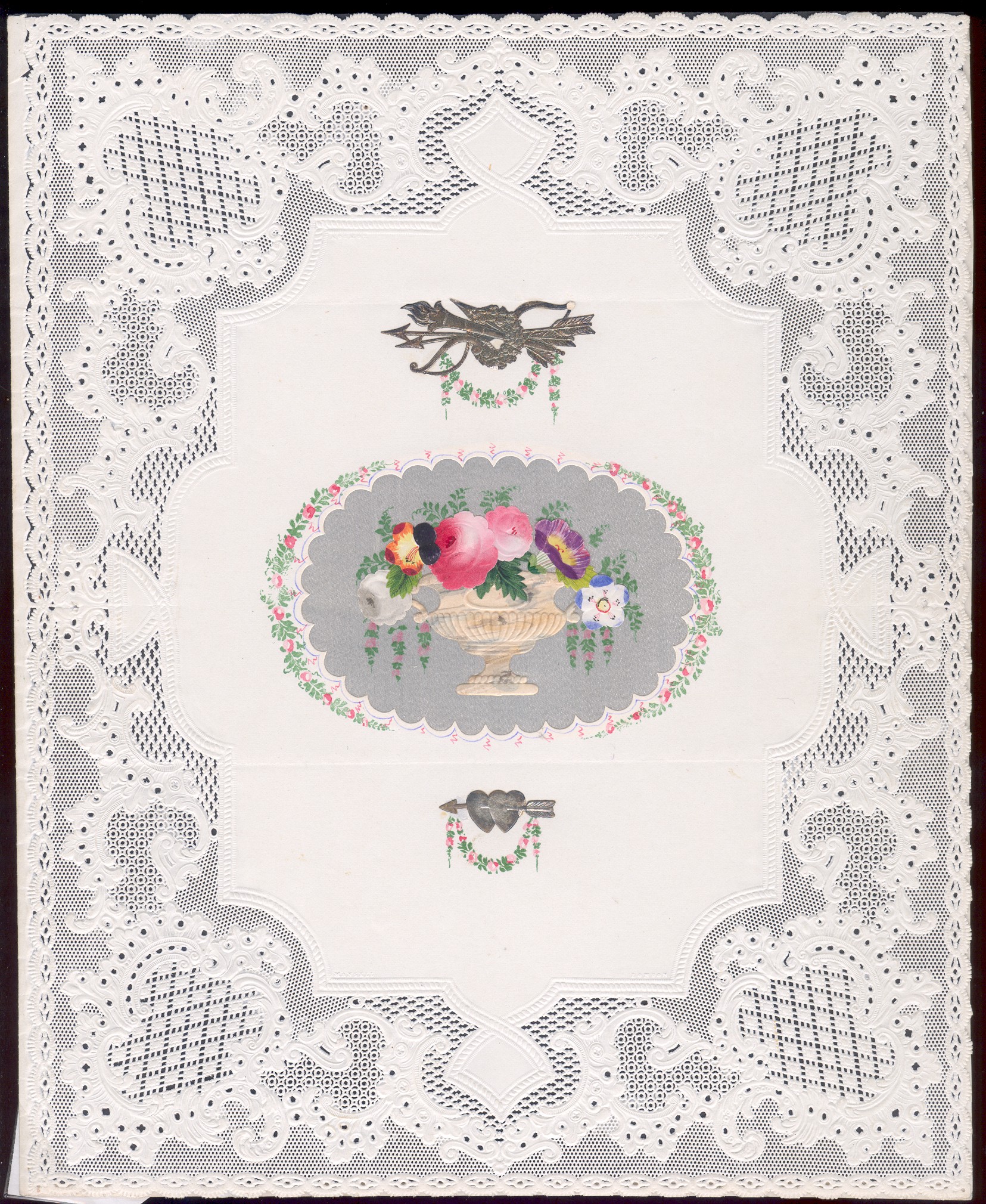 Here is an opportunity to acquire an original and unused mid-nineteenth century paper lace Valentine with hand-painted garlands. The central silk panel features an urn of colourful flowers, all cut out and hand-painted.