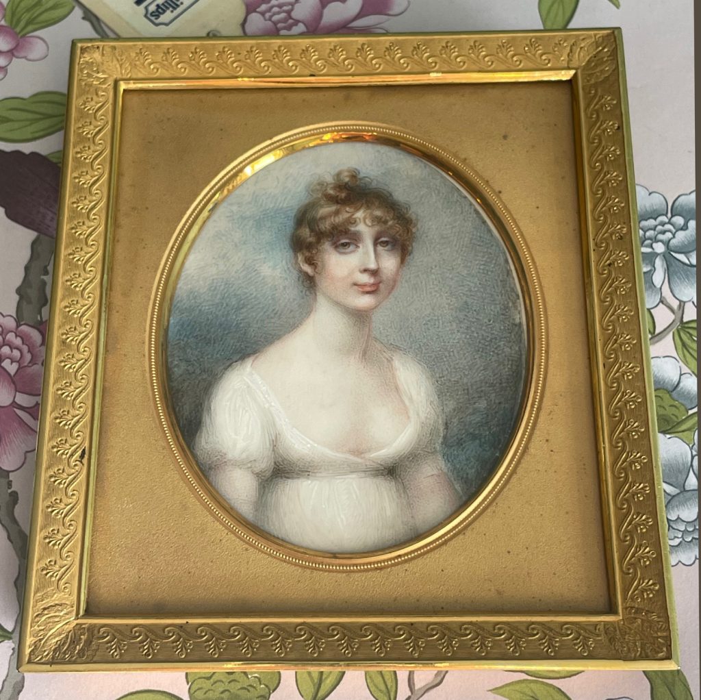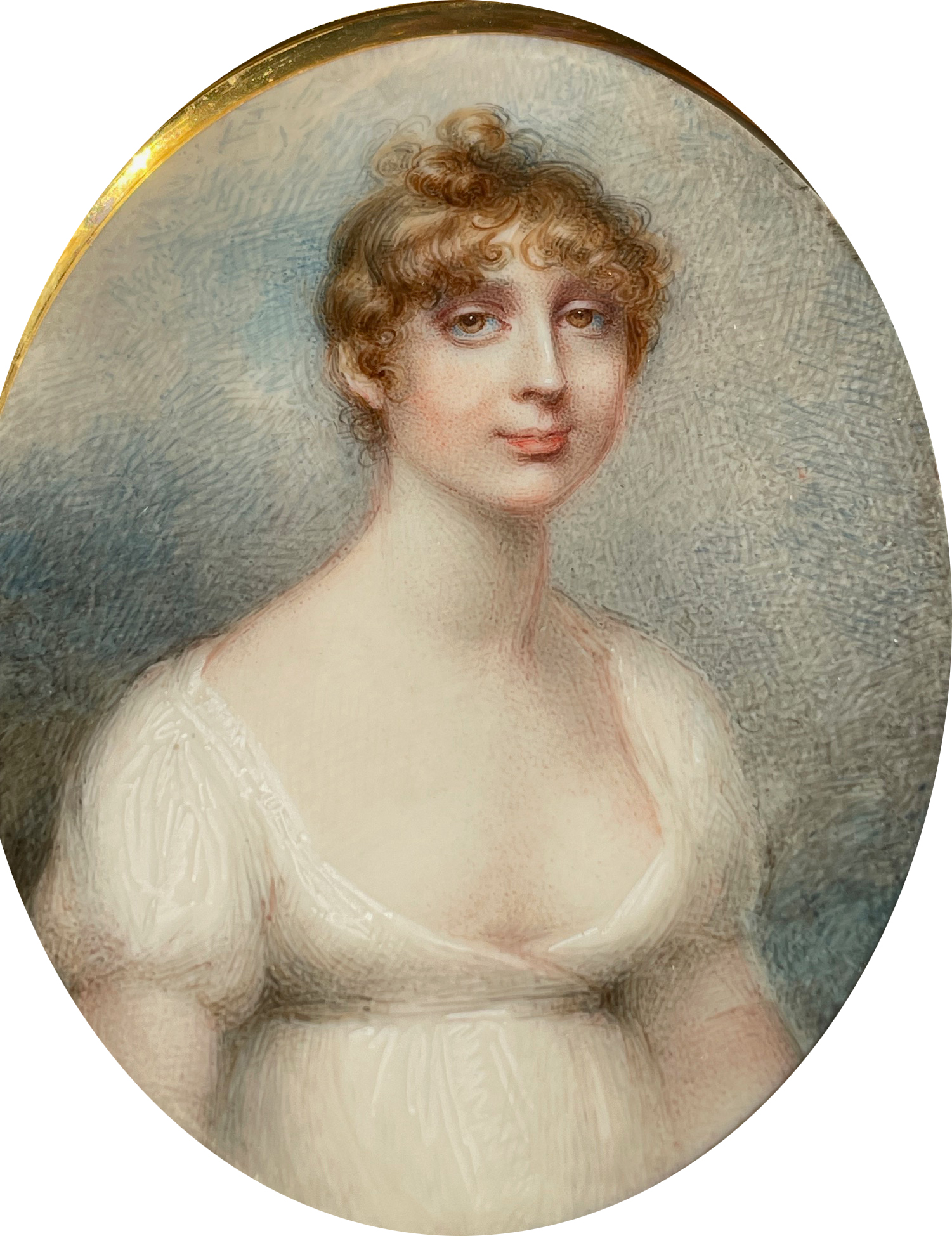 This poignant portrait of Christian St Barbe in a décolleté gown was most likely painted as a gift for her future husband, Rev. Charles White, whom she married in 1802 at the age of seventeen.