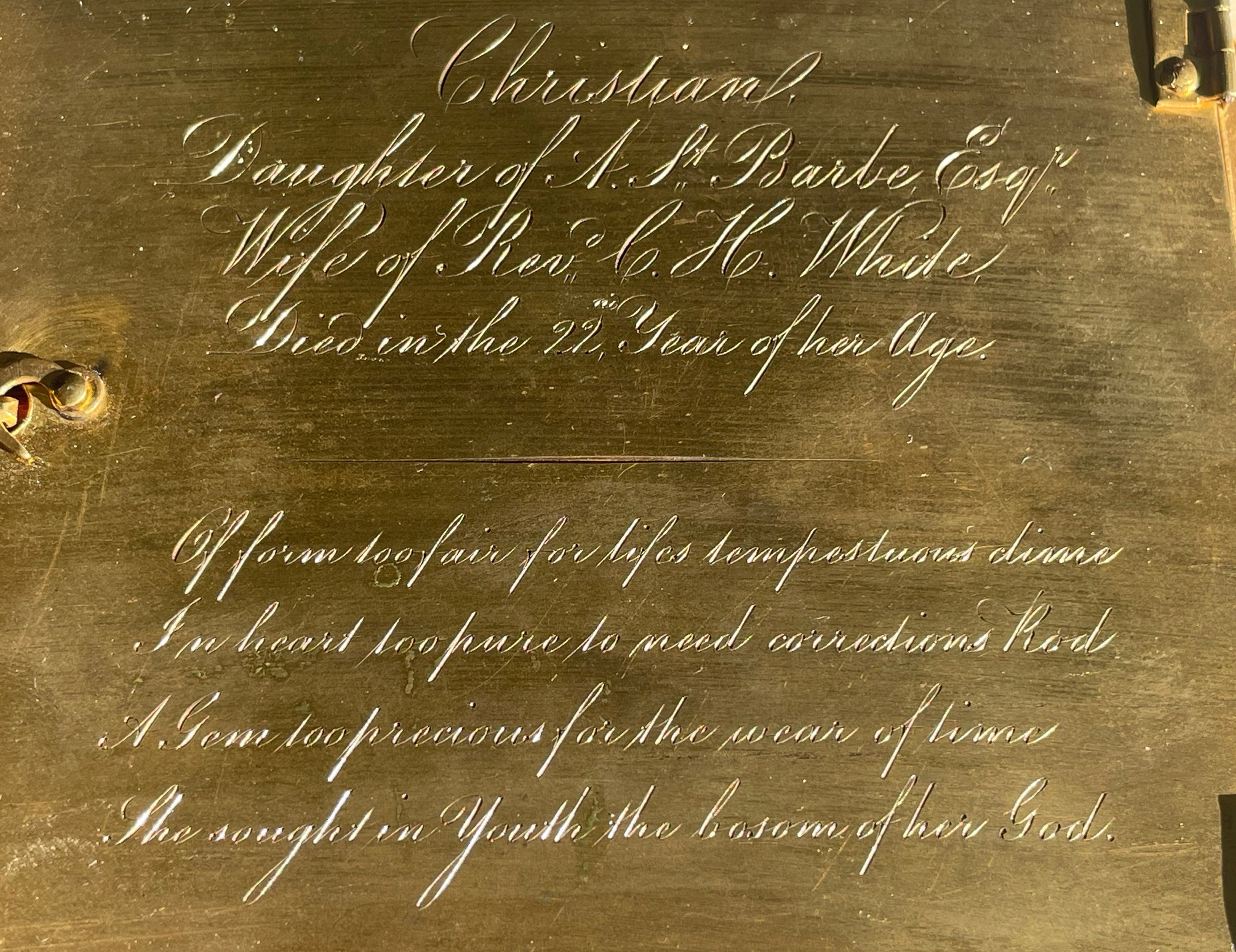 Christian was just fifteen when her father died; two years later she married Rev. Charles Henry Cooper White MA who was twenty years her senior. Rev. White has been colourfully described as “an old-fashioned parson, farmer, sportsman [and] volunteer soldier” who brewed beer and played cricket. The couple had two daughters: Eleanor born in 1803 and Christiana born in 1804. Two years later, most likely in childbirth, Christian died, aged just 21. A memorial plaque dedicated to her was erected at St Nicholas Church, Fyfield in Hampshire.