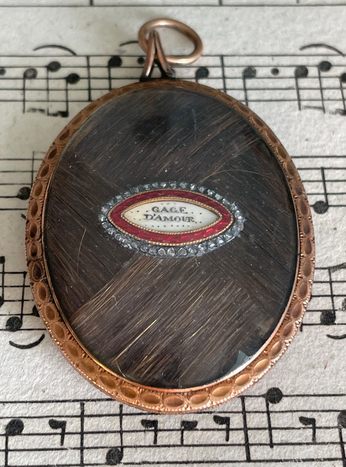 The portrait is signed with initials and dated 176- (the final digit is obscured by the edge of the frame). It is handsomely framed with a tiny seed pearl border, the reverse glazed to show plaited hair and the phrase GAGE D’AMOUR (pledge or token of love) inscribed on a plaque within a jewelled border.