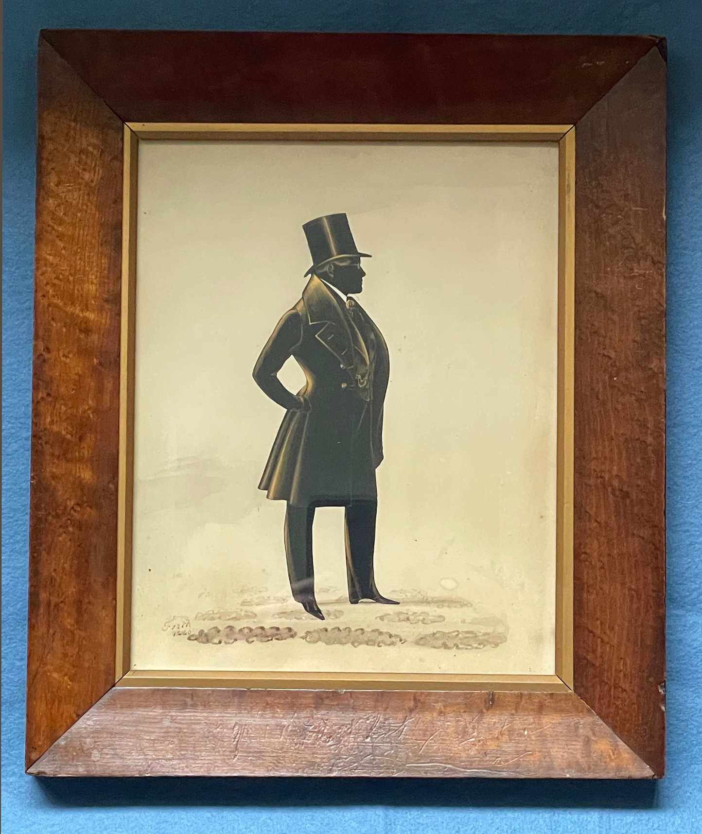Expertly cut and finely gilded in 1840, this full-length silhouette shows a well-dressed gentleman wearing glasses. His frock-coat with its deep lapels with buttonholes is typical of the 1840s as is his Wellington style top hat. Note too the double watch chain attached to his waistcoat.