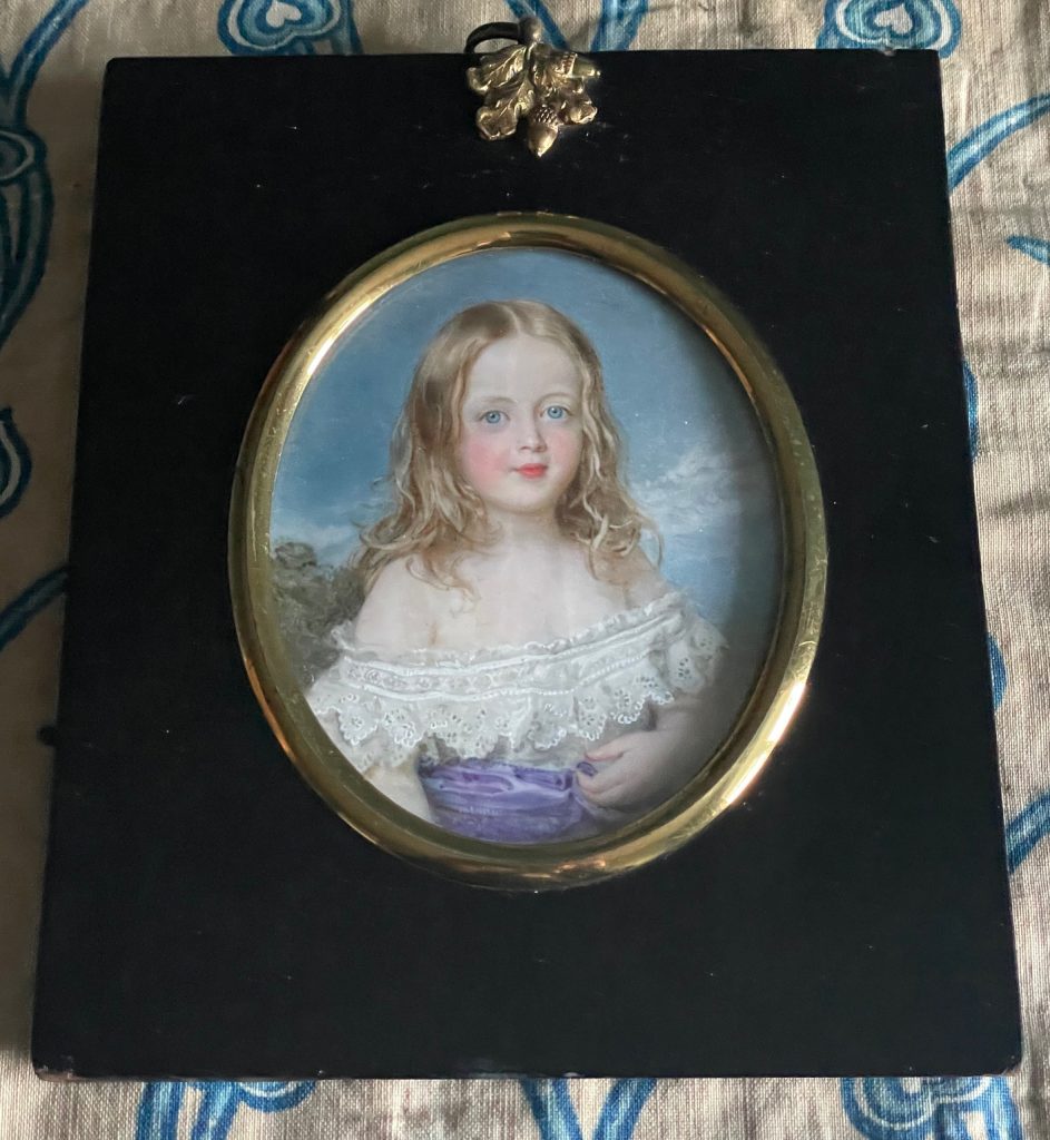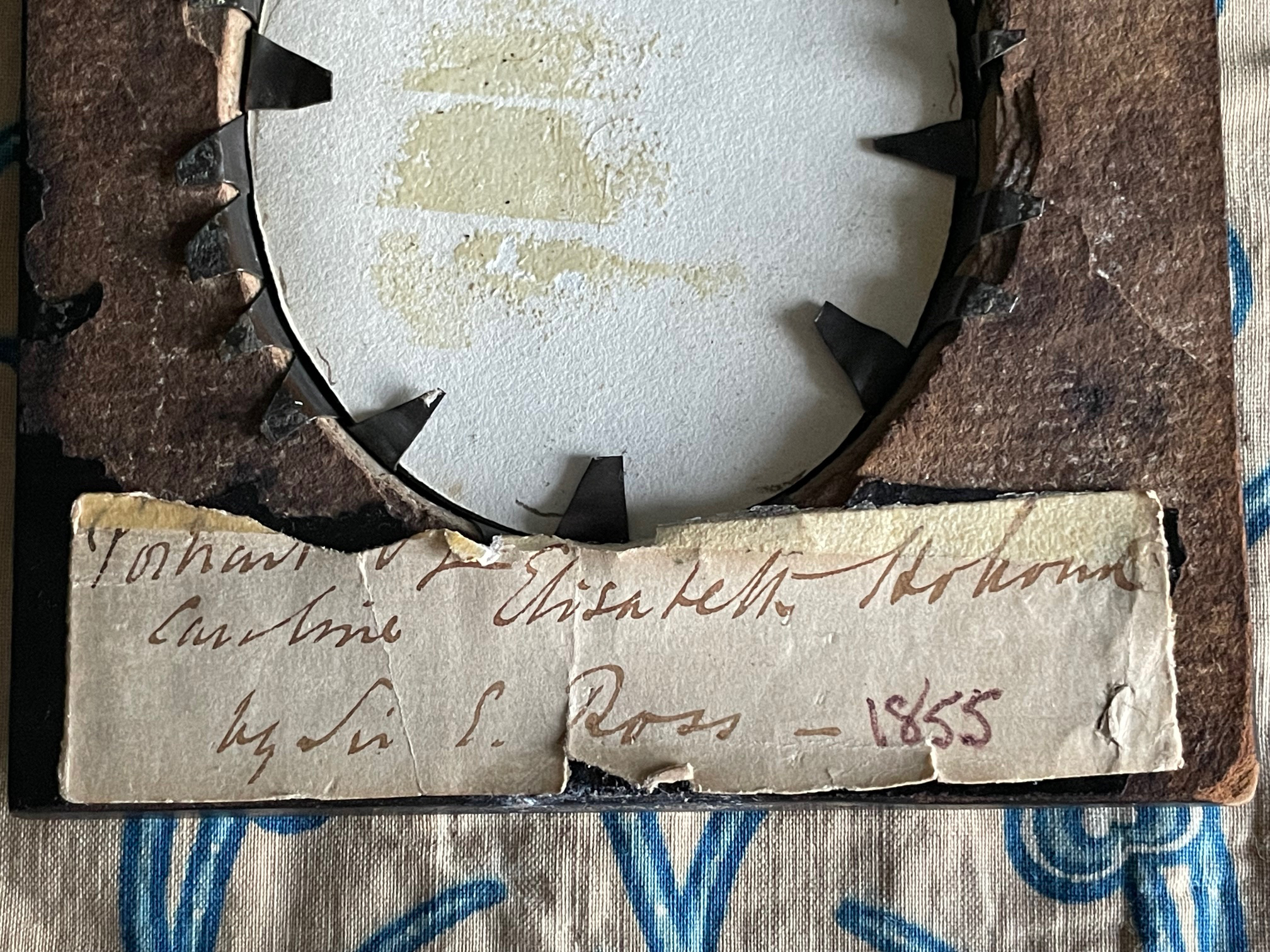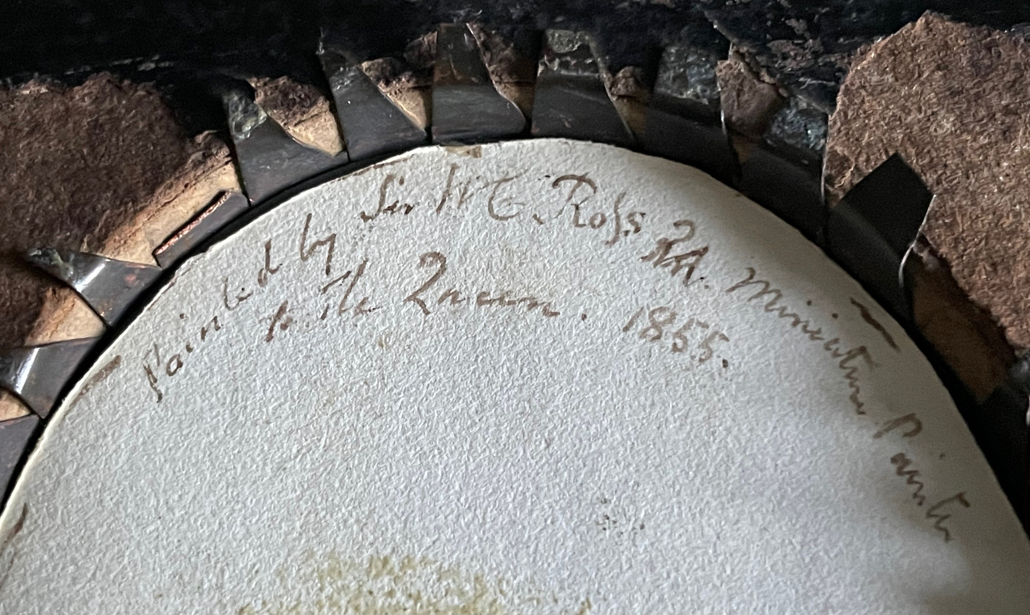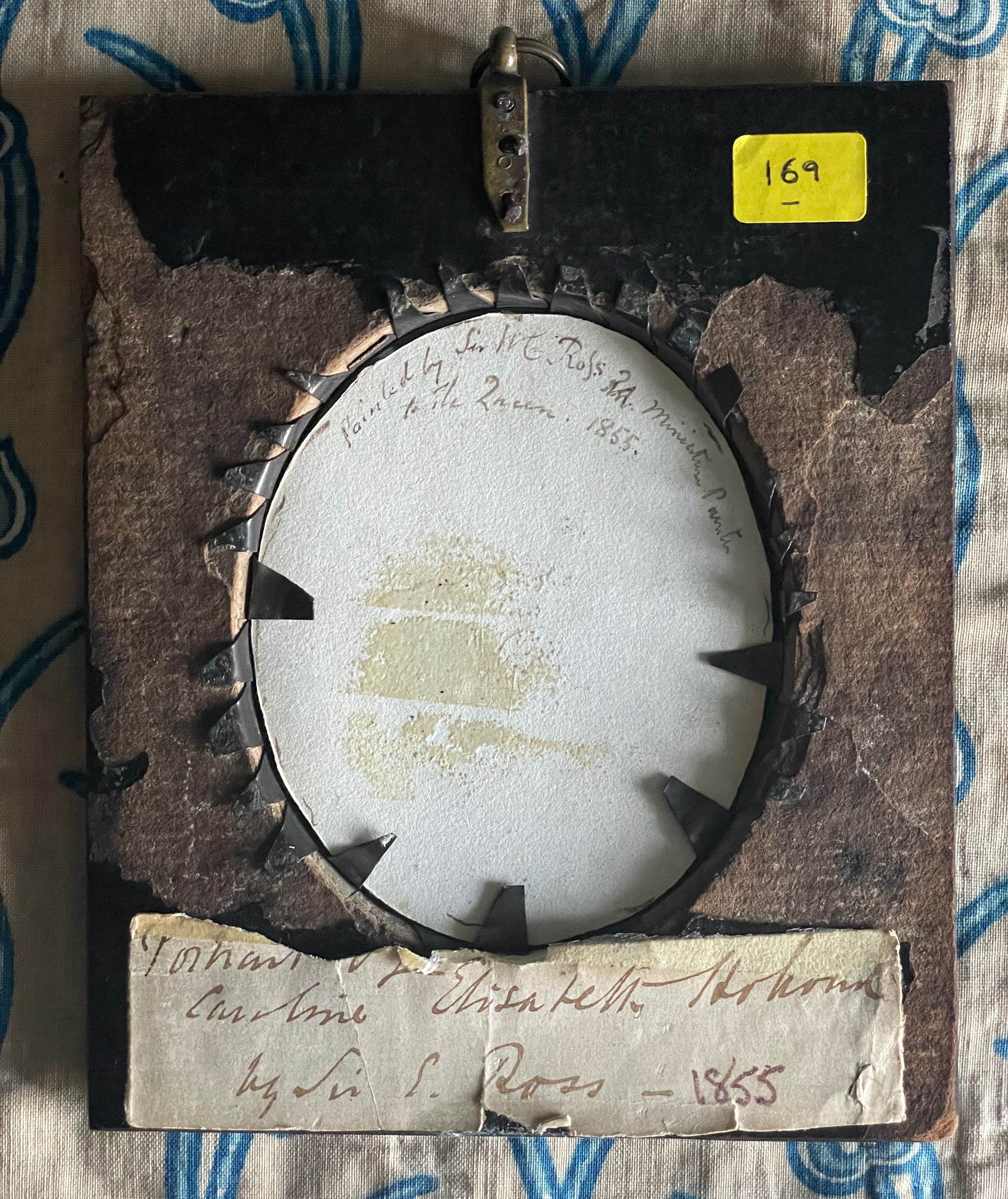 The portrait is signed and dated on the reverse – ‘Painted by Sir W. C. Ross RA Miniature Painter to the Queen, 1855’ and is presented in a traditional papier-mâché frame with an acorn hanger. A hand-written label names the sitter as Caroline Elizabeth Holland.