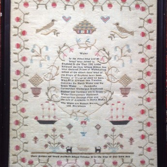 A Welsh sampler serving not only as a lesson in stitching for young Mary Evans but also as a geography and history lesson combined. Mary was a pupil at Pwllhely School (spelled Pwllheli nowadays) in north-west Wales and she completed her task on the last day of October 1812.