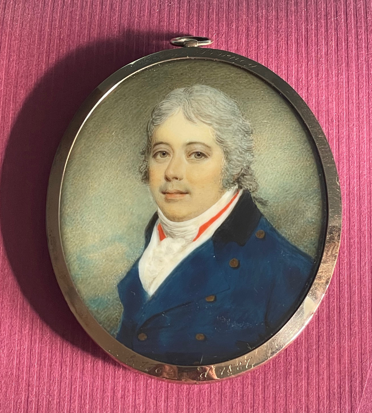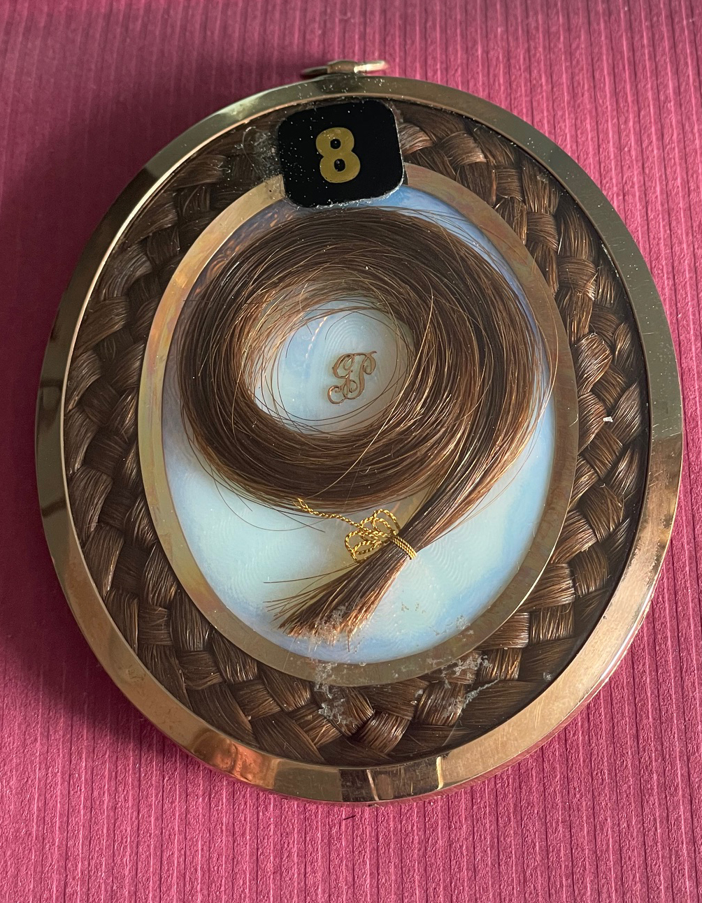 The portrait is presented in a gold frame that is engraved on the front with the sitter’s name and dates. The reverse is glazed to show a lock of brown hair tied with gold wire encircling the initials GP laid on opalescent glass and surrounded by a band of neatly plaited hair.