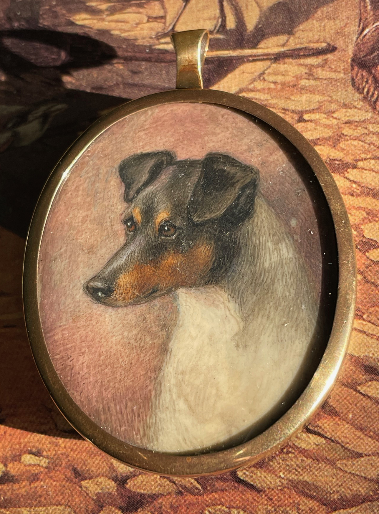 This is a delightful and nicely painted miniature portrait of an inquisitive-looking brown and white terrier. The portrait is unsigned and is set in a gilt metal frame that is glazed reverse to show olive green silk.