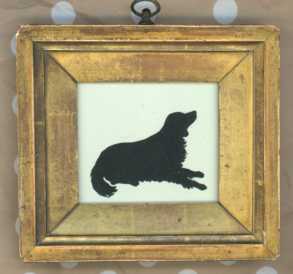 Although best known for his individual silhouettes of people, Edouart also cut family conversation pieces that often included the family dog. He kept scrapbooks in which he pasted his practice and experimental cuttings. These scrapbooks and his archive of work were mostly all lost to the sea when Edouart was shipwrecked off the coast of Guernsey in 1829. Some years ago a salvaged scrapbook came to light in a Parisian bookshop and this is the source of this unique cutting of a spaniel waiting for the next treat.