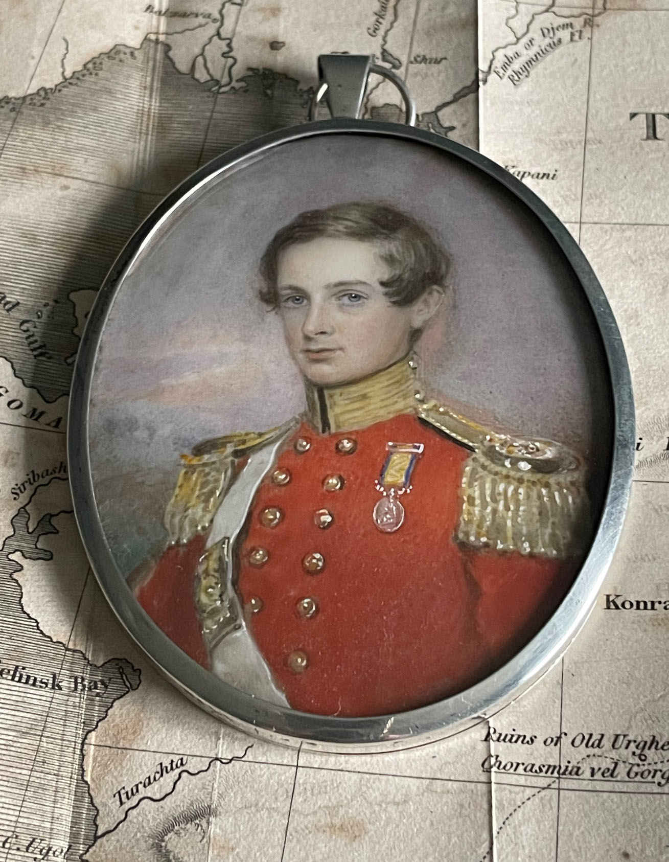 The artist’s signature – R. S. Bennett – is scratched along the rim at 8 o’clock. Based in London, Bennett exhibited at the Royal Academy between 1845 and 1848. The portrait is set in a hallmarked silver frame that is glazed on the reverse to show cream silk.