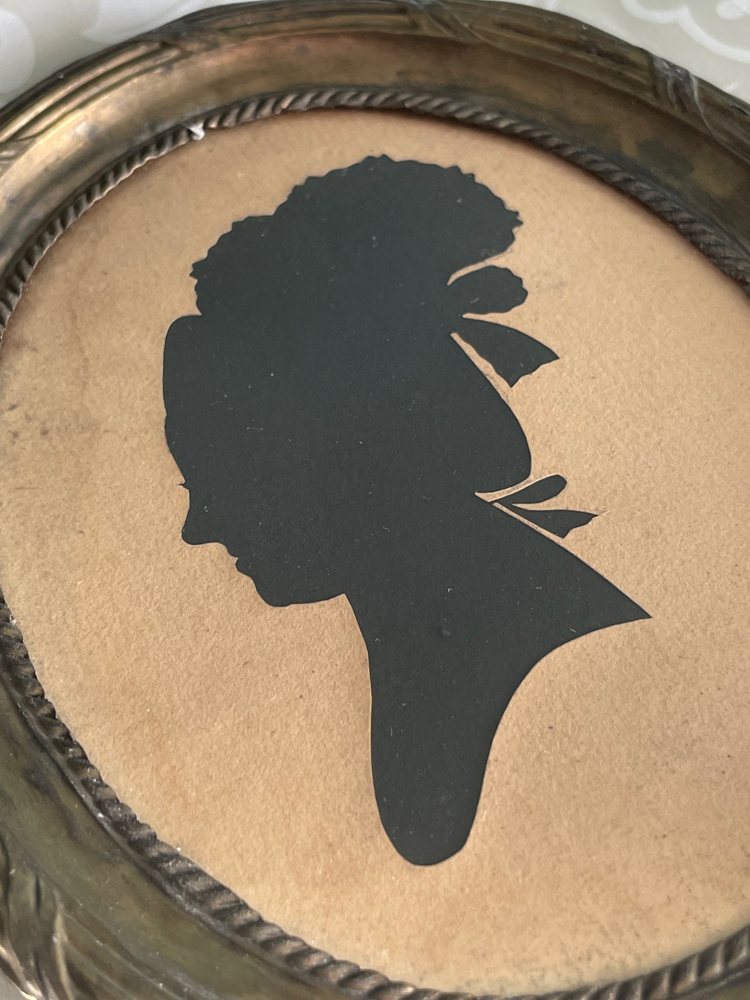 Working during the eighteenth century, Sarah Harrington specialised in ‘hollow-cut’ silhouettes where the profile was cut out of white paper but it was the surrounding paper that was retained and backed with either black paper or silk. This profile is typical of her work and is set in the original decorative pressed brass frame that she favoured.