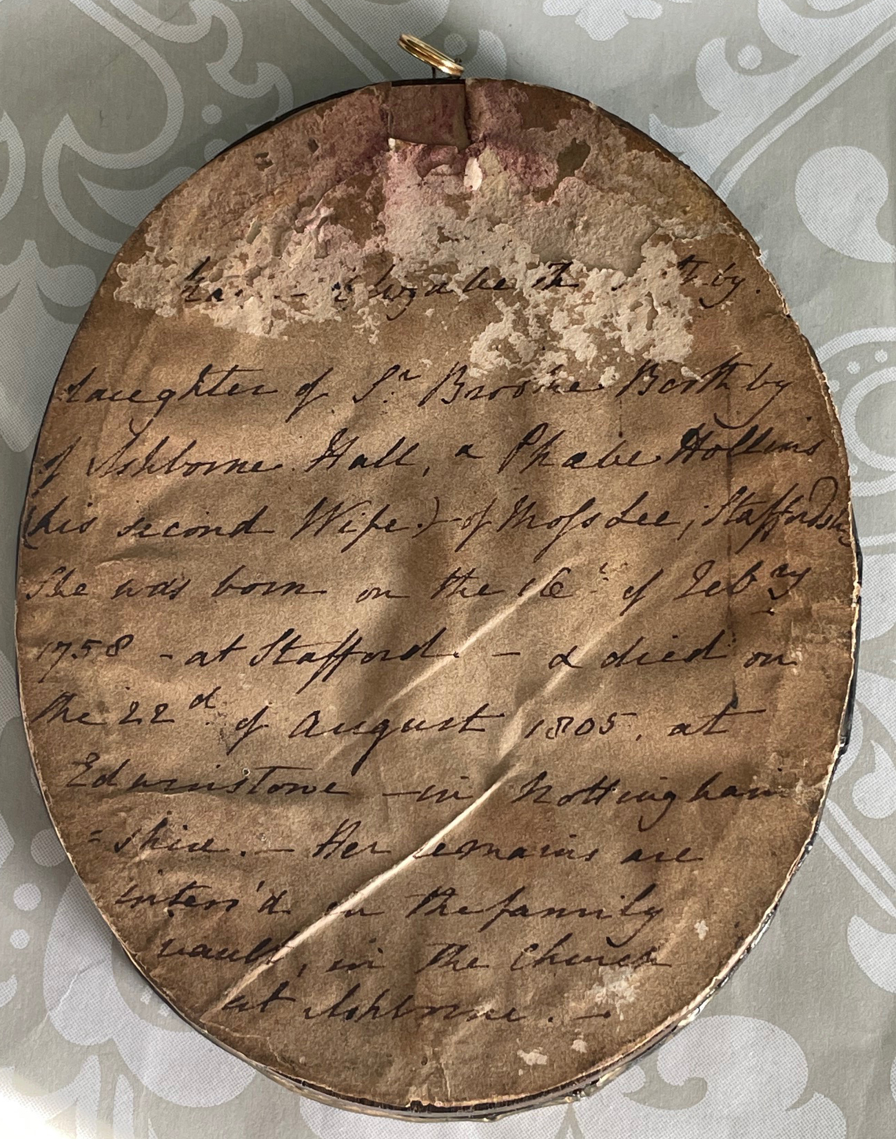 A partially obscured but lengthy inscription on the reverse of this hollow-cut silhouette names the sitter as Maria Elizabeth Boothby. Born in February 1758, she was the youngest child and only daughter of Sir Brooke Boothby, 5th Baronet and his second wife, Phoebe Hollins. The family seat was Ashbourne Hall in Derbyshire. Maria’s elder brother, the future 6th Baronet, was a poet who dedicated several poems to his beloved sister. Her likeness was also captured by Sir Joshua Reynolds amongst others. Maria died unmarried in 1805, aged 47.