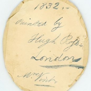 A confident portrait that succeeds in conveying the character of its subject, a matriarchal figure named Mrs Vint. Signed reverse – ‘Painted by / Hugh Ross / London / Mrs Vint’ and dated 1832.