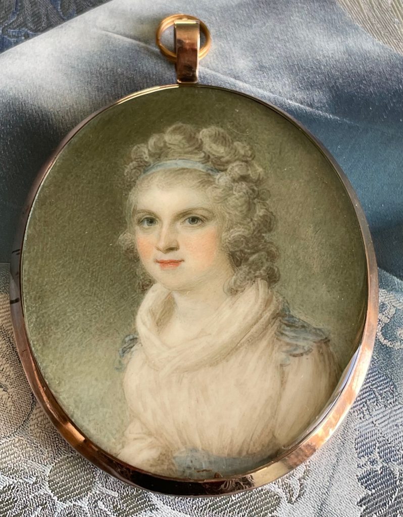 The softness of Shelley’s palette coupled with his strong facial draughtsmanship, as seen in this portrait, makes his work recognisable. His miniatures of ladies and children are particularly attractive. Dating to the late 1790s, this lady wears a traditional white cross-over gown and has clear blue eyes, rosebud lips and a youthful glow to her cheeks. Her abundant curls have been powdered and secured with a blue ribbon bandeau.