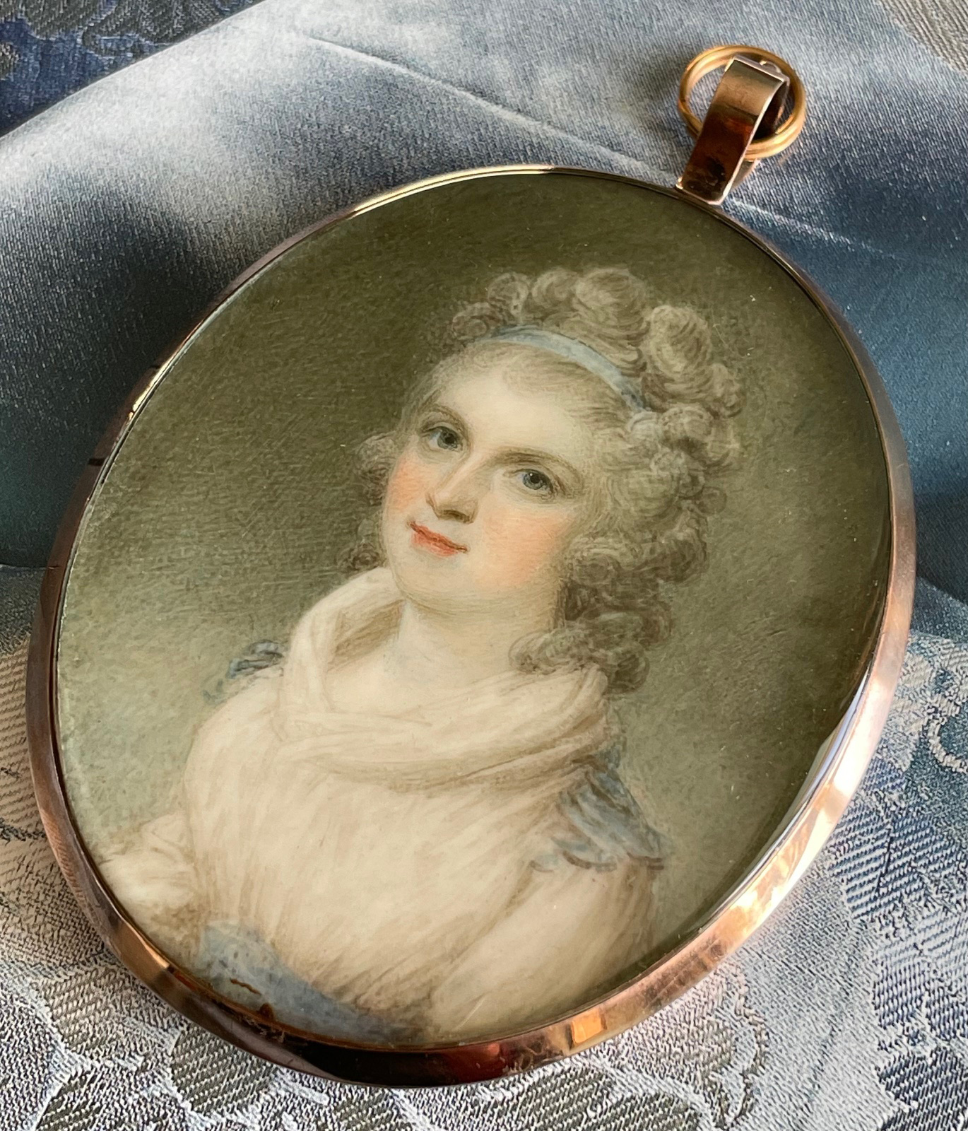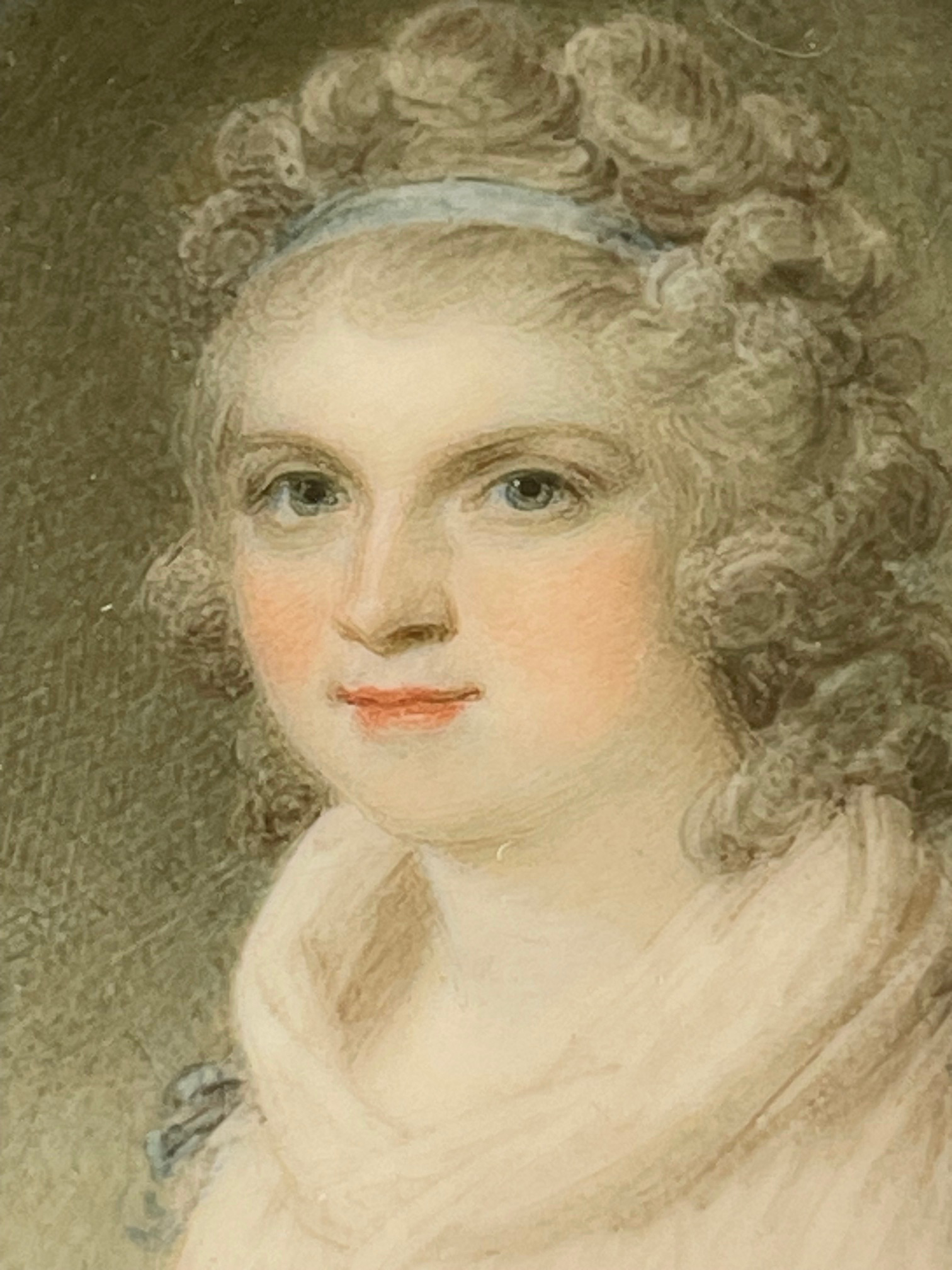 The softness of Shelley’s palette coupled with his strong facial draughtsmanship, as seen in this portrait, makes his work recognisable. His miniatures of ladies and children are particularly attractive. Dating to the late 1790s, this lady wears a traditional white cross-over gown and has clear blue eyes, rosebud lips and a youthful glow to her cheeks. Her abundant curls have been powdered and secured with a blue ribbon bandeau.