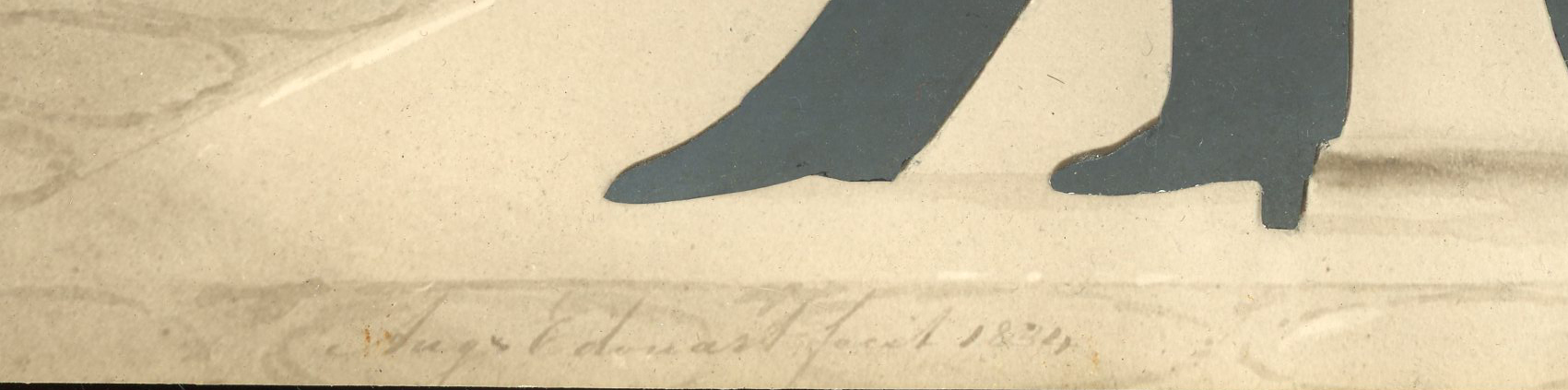The couple are situated in an elegant drawing room furnished with fringed drapes, a chaise longue and framed paintings. The silhouette is signed along the bottom edge – Aug. Edouart fecit 1834.