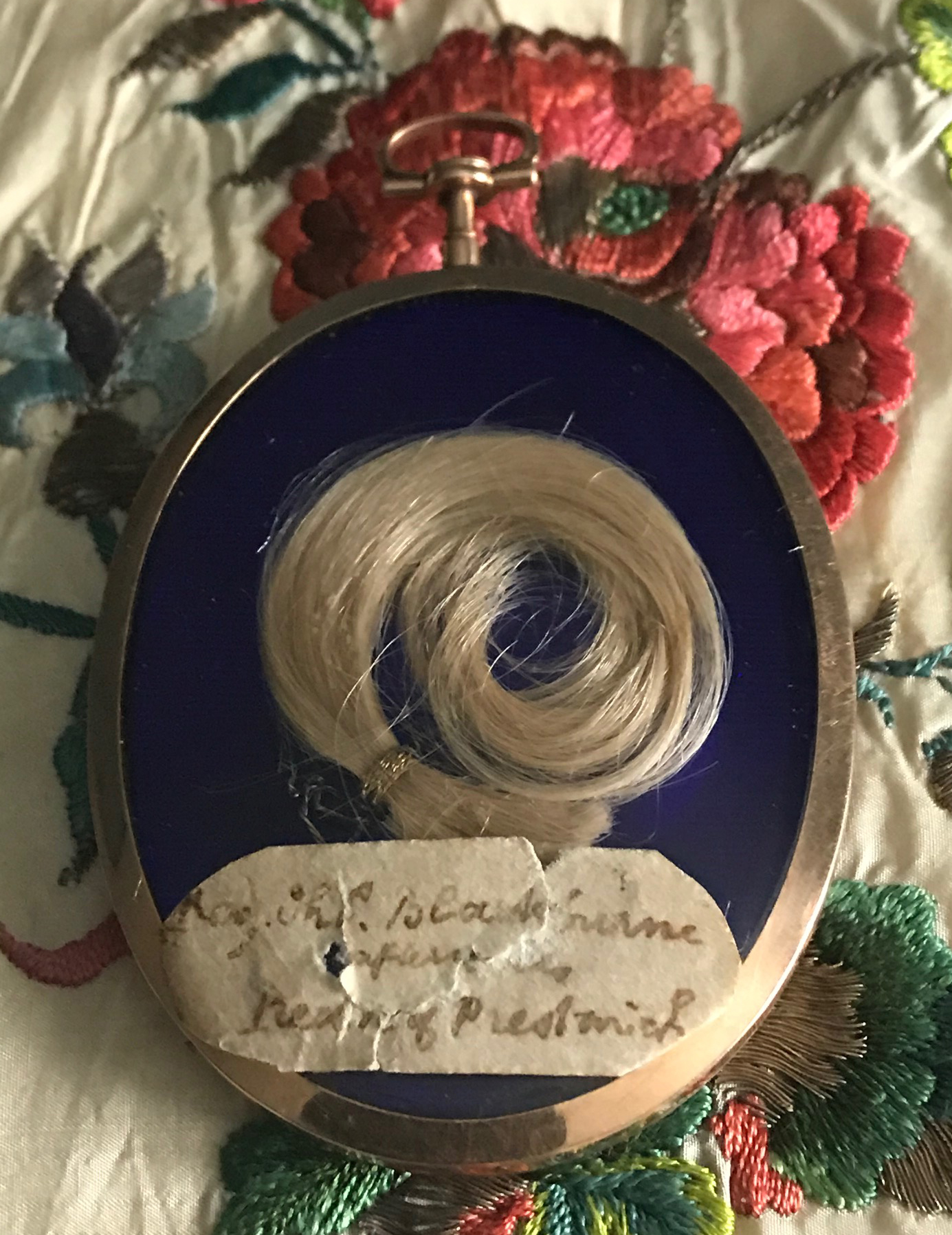 The portrait is signed and dated bottom right – P. Mc 92 – and is set in the original gold fausse-montre frame, the reverse glazed to reveal a lock of blonde hair tied with gold wire laid on foiled blue glass. An old hand-written label on the back of the frame reads ‘Rev. Ths Blackburne / afterwards / Rector of Prestwich’.