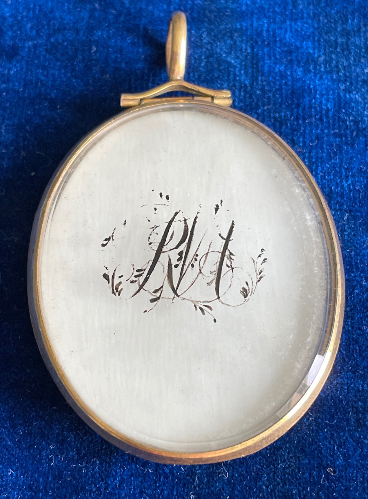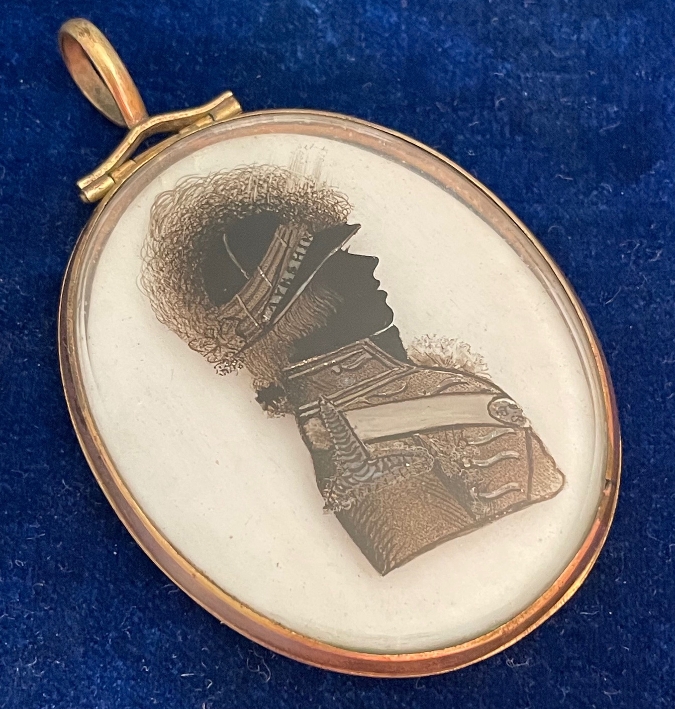 The silhouette is housed in a locket frame with a painted monogram of the sitter’s initials on the reverse.
