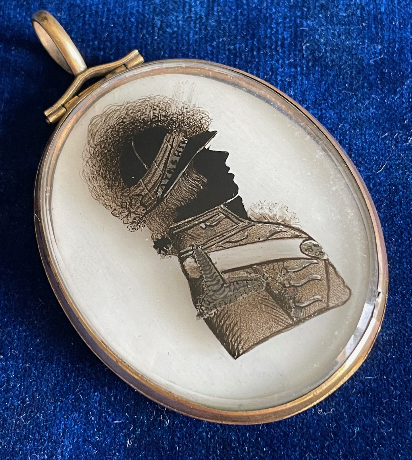 Reverse painted on convex glass with gold and silver highlights and scratched out detailing, this silhouette is by the hand of Mrs Elizabeth Hudson. It depicts a young officer from the Ayrshire Yeomanry wearing a Tarleton helmet with the letters AYRSHIR visible on the brim. He has an epaulette and his cross belt appears to have decorative initials on the badge.