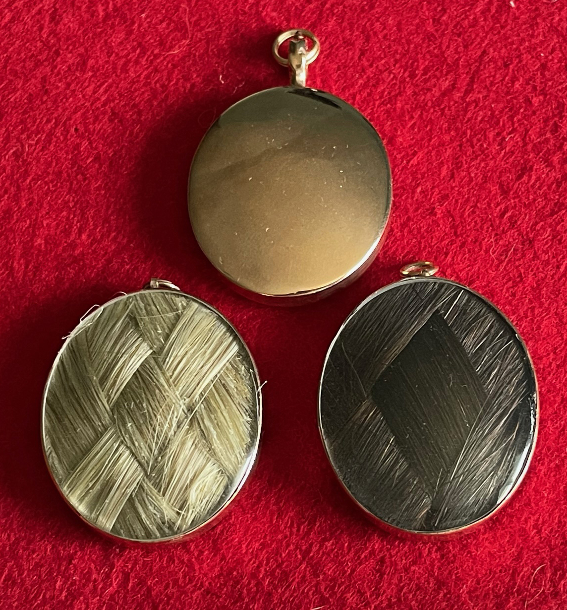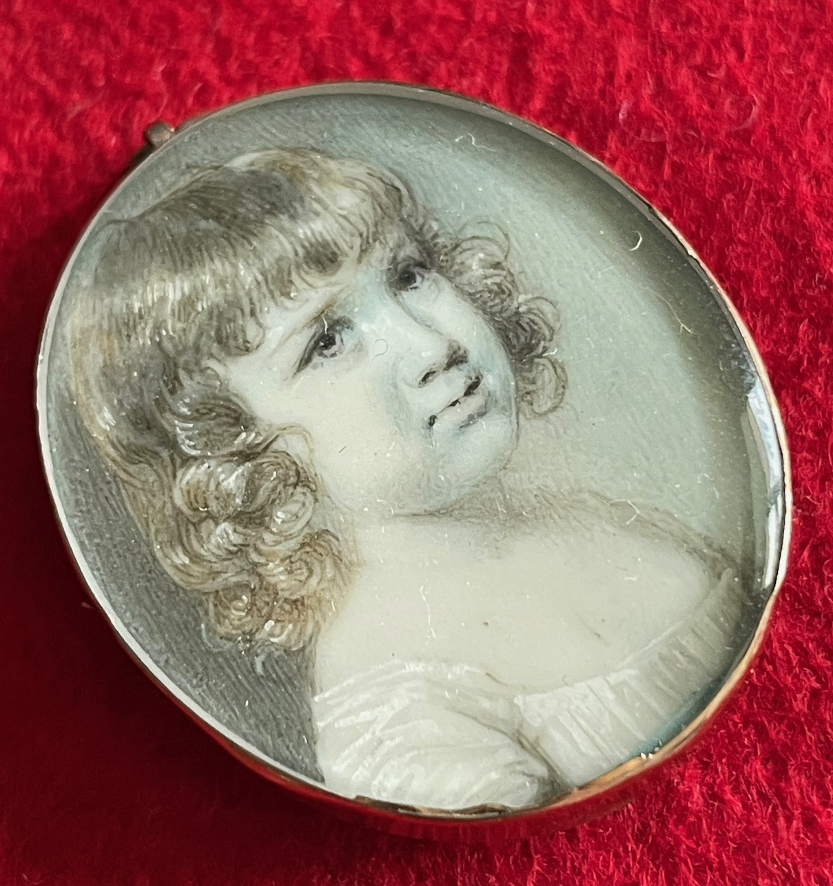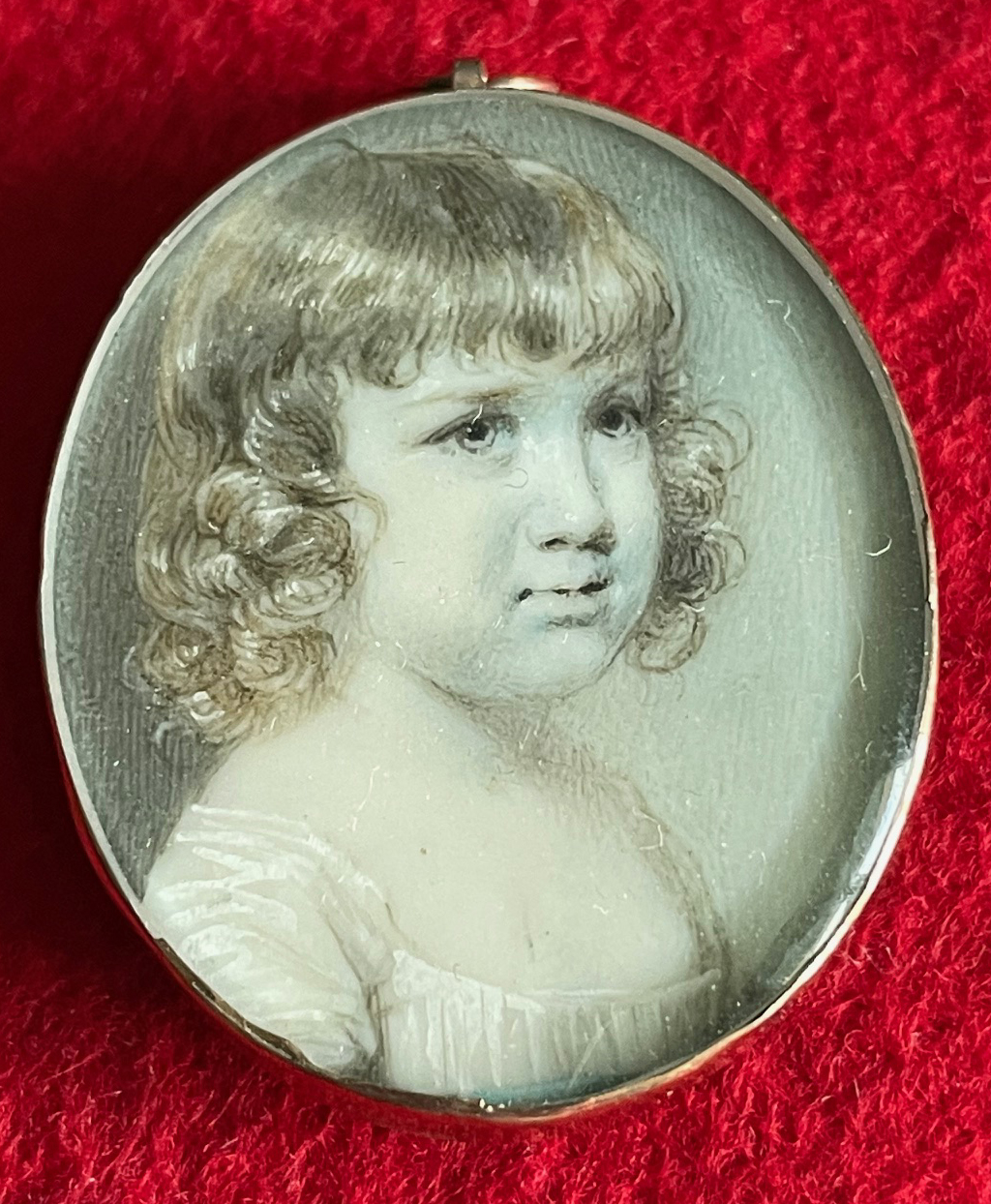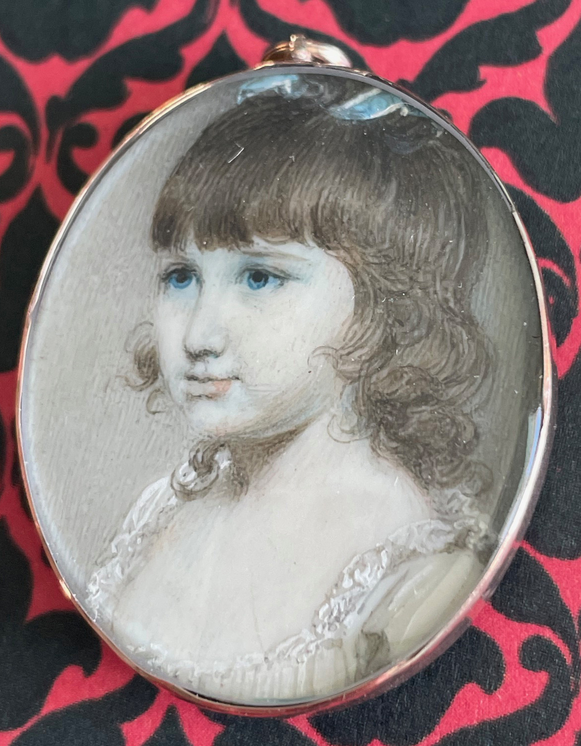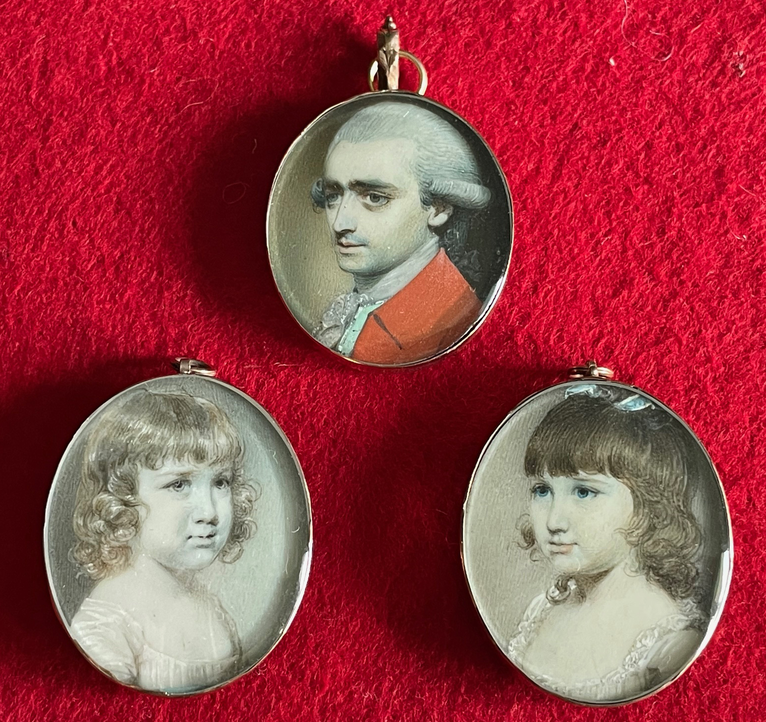 The miniatures are housed in matching frames, the two children with plaited hair reverse.