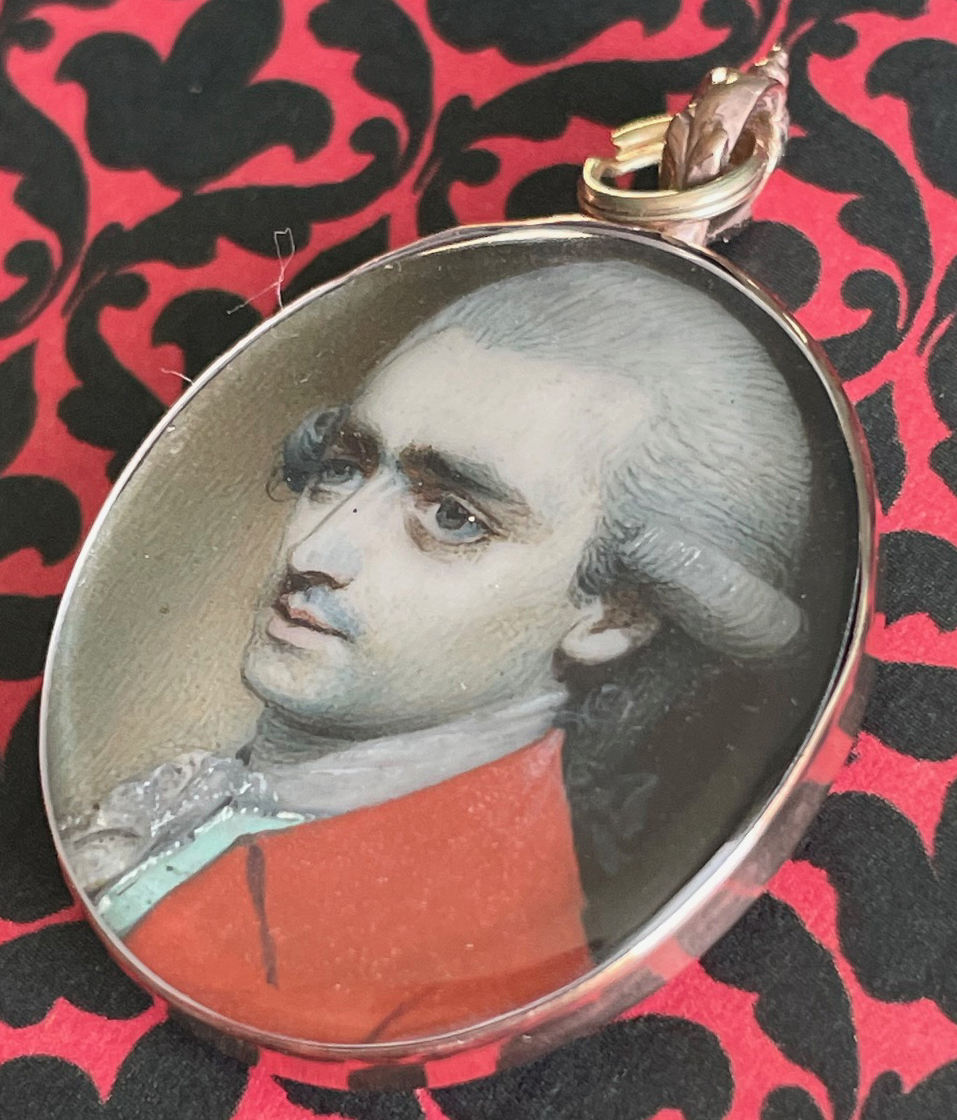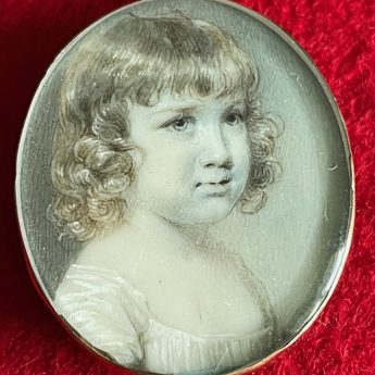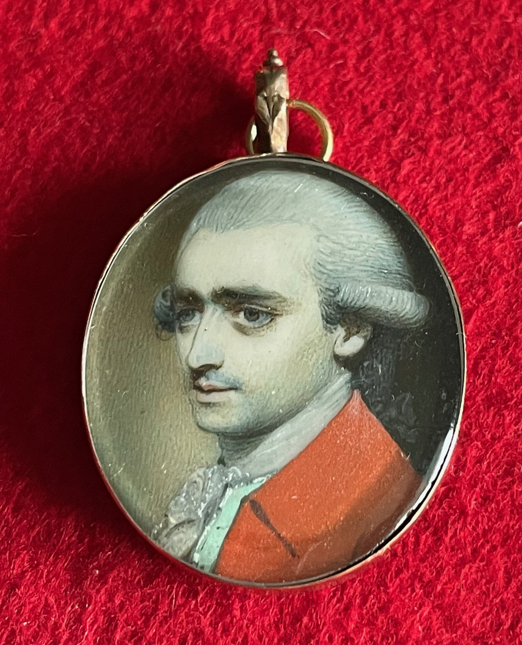 Family portraits that have stayed together are always a special find. This group of three miniatures comes from the Chambers Family: the father wears a striking scarlet coat, his powdered wig en queue tied with black ribbon; and, his two children in matching muslin dresses, the elder child with a blue and white ribbon in her dark hair. Sadly, their individual names have been lost to history along with their story. According to the artist’s fee book, Engleheart painted several portraits of the Chambers Family between 1776 and 1782 including Master G., Miss C., Miss L. and Miss Sabina, all painted in 1776.