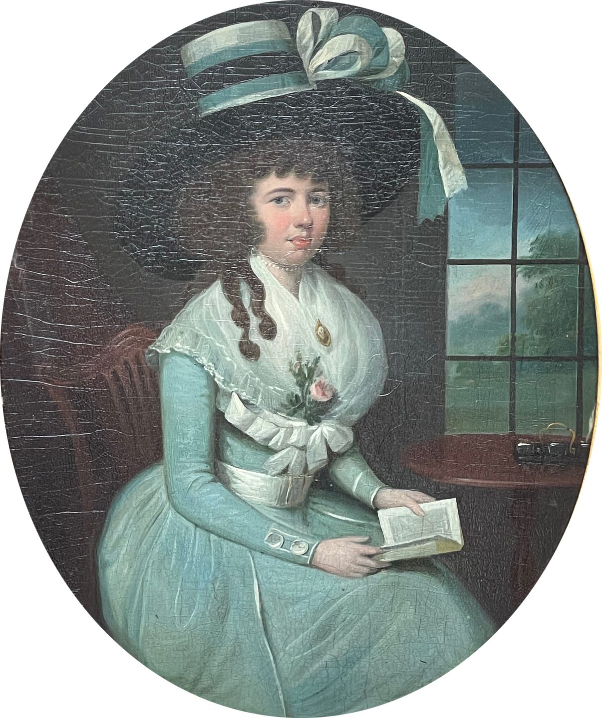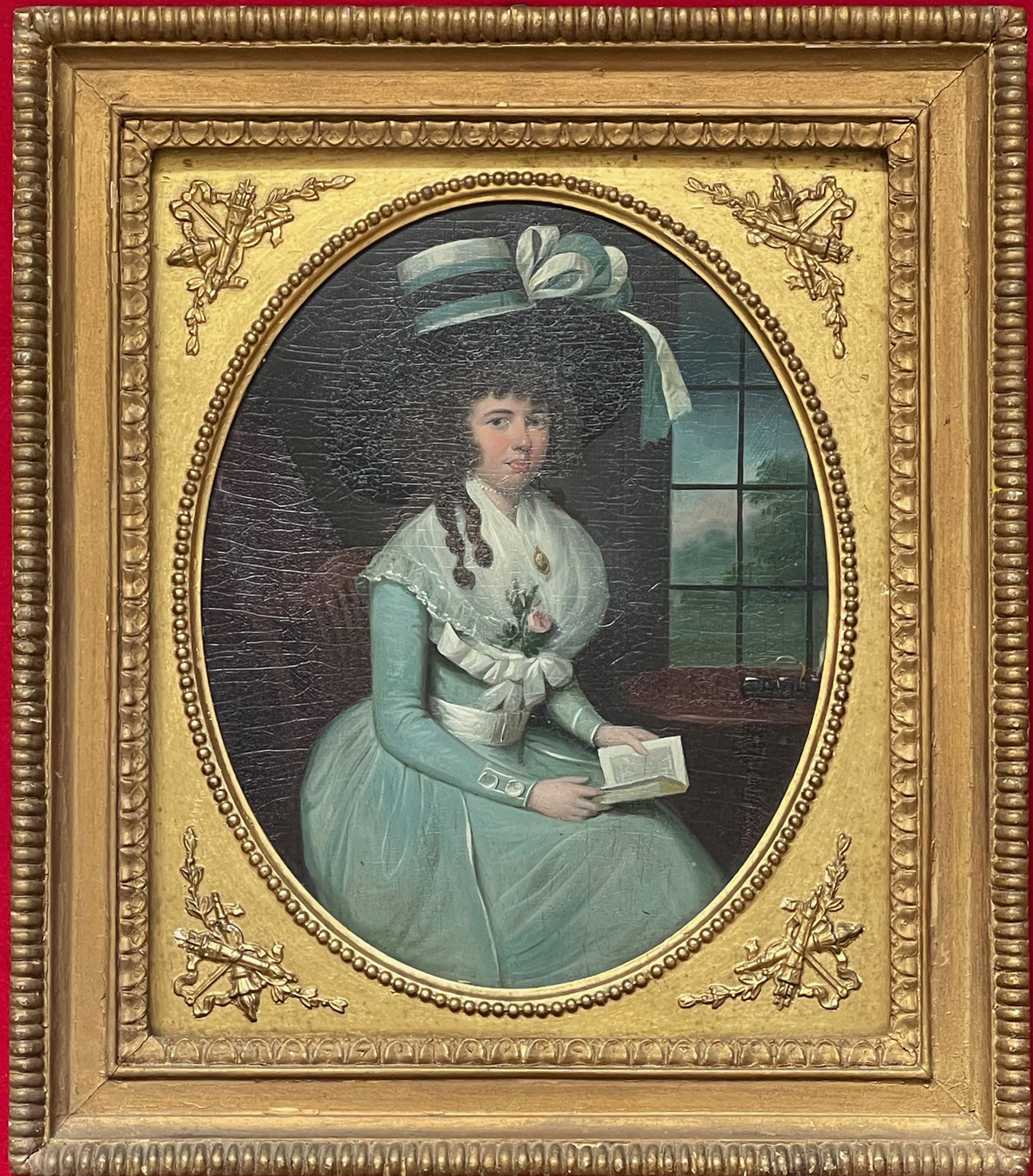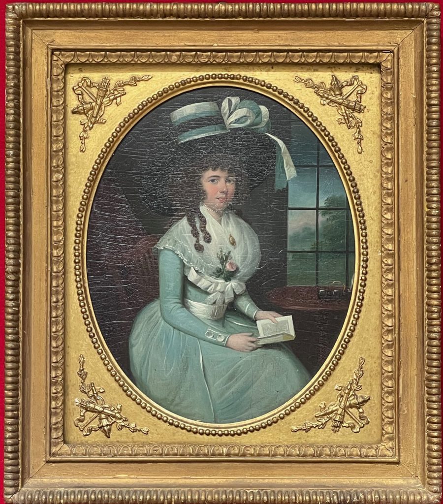 Painted around 1780, this stylish young lady reads the latest novel as she sits on a Hepplewhite style chair beside a small pedestal table placed by a window with a pastoral landscape view beyond. The artist has cleverly used the window to introduce light and perspective to this striking portrait.