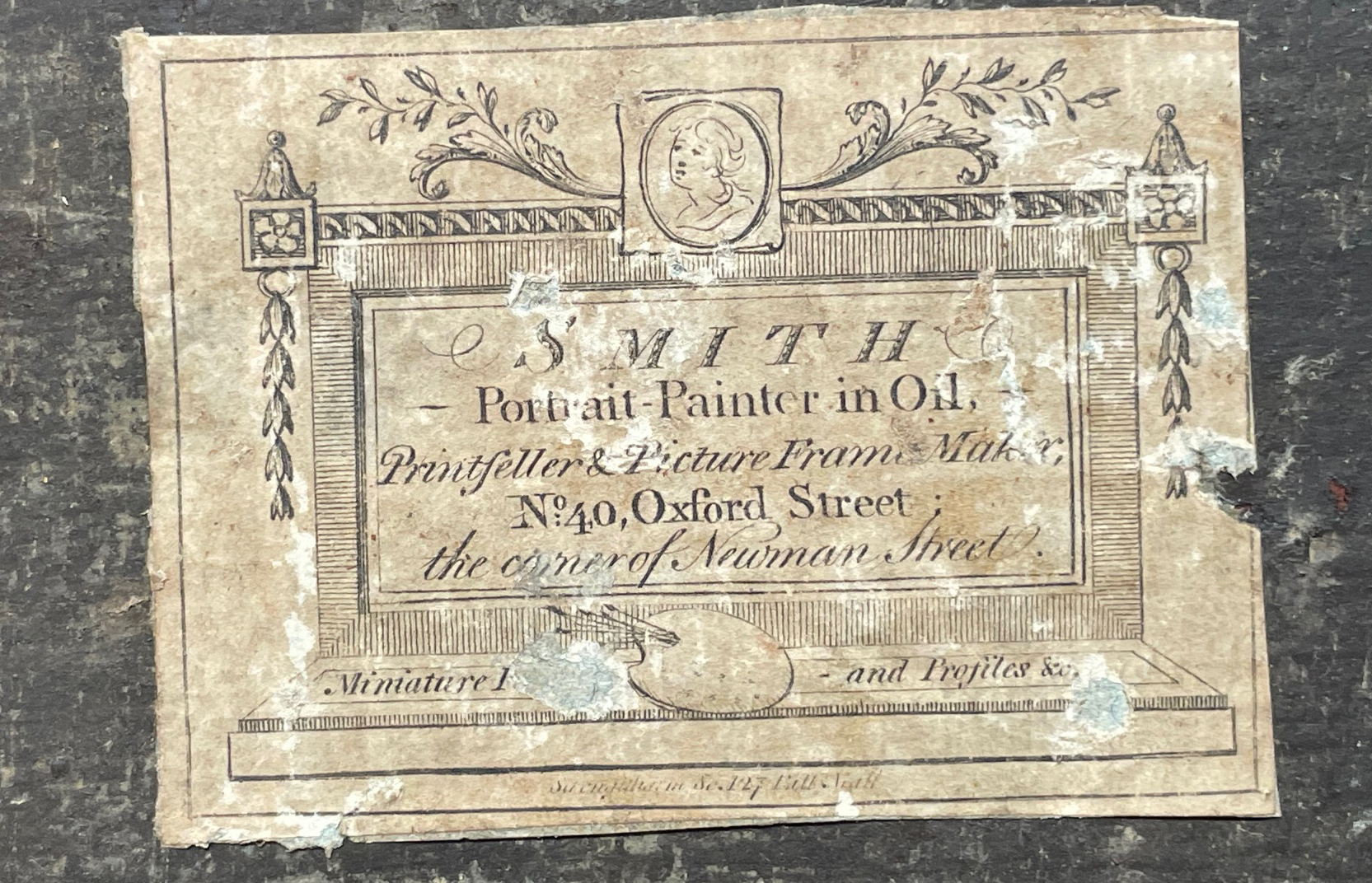 Despite being an accomplished artist, there are few details recorded on Smith. He has been listed erroneously in some reference works as James Smith but new evidence suggests he was actually named William. In 1787 William Smith took out an insurance policy with Sun Fire Office for his premises at 40 Oxford Street, the address used on this artist’s trade labels. A William Smith, who may be the same artist, exhibited three miniature portraits at the Royal Academy in 1774 from an address in nearby Berwick Street.