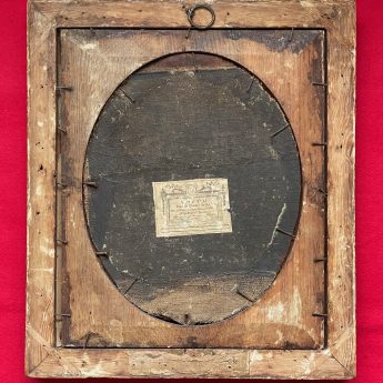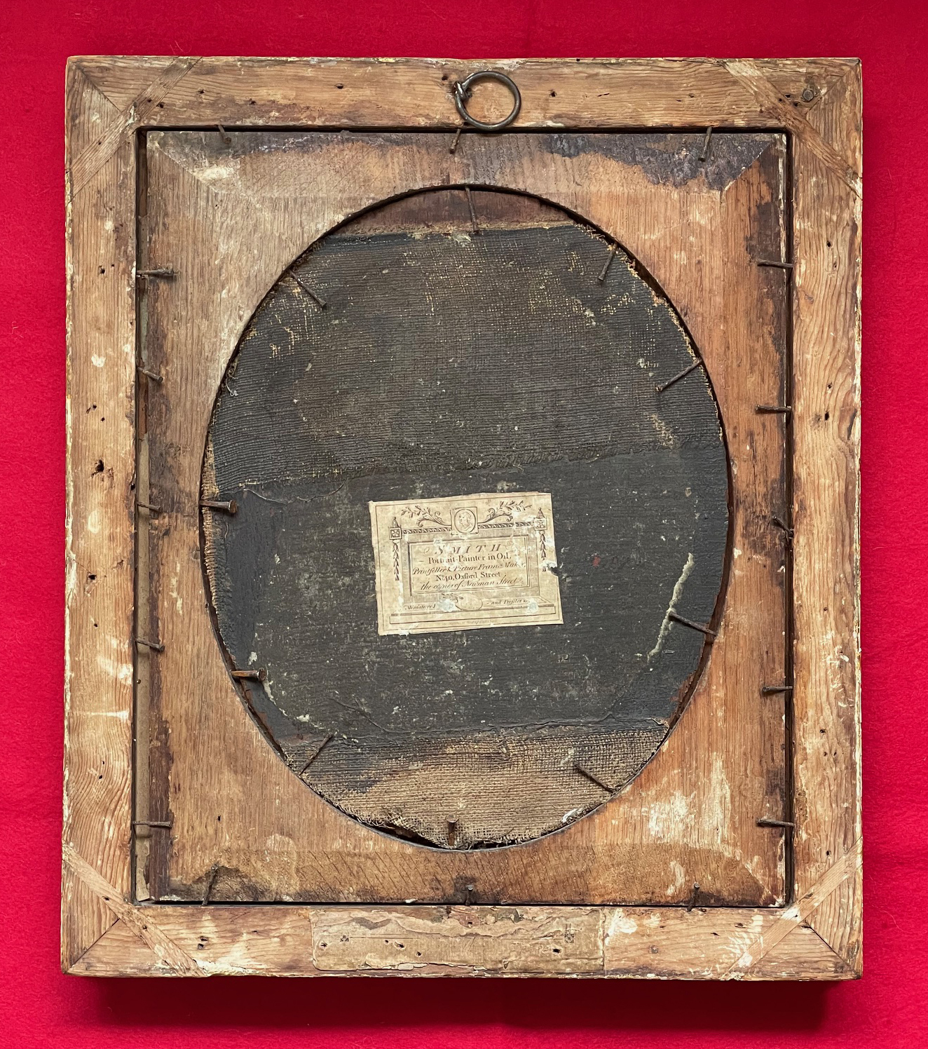 Painted in oil on canvas laid on board, the painting has surface craquelure but is otherwise fine and without paint loss. The oval portrait is presented with a decorative mount within a period giltwood frame with a piecrust border. The artist’s trade label is affixed reverse –