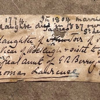 Born in 1774, Frances was the daughter of James Torr of Westleigh in Devon and his wife Rebekah (née Hooley) whom he married in London in September 1770. From the hand-written label on the back of the frame we can glean that Frances married a surgeon in 1804 and had at least one daughter.