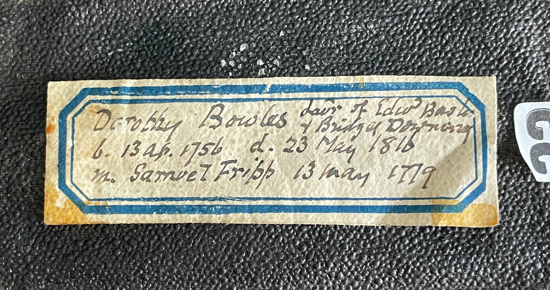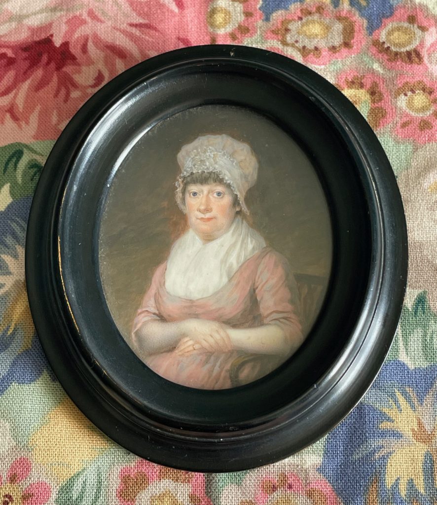 The lady in this portrait is named as Dorothy Fripp. She was born in Holborn, London in 1756, the eldest of eight children born to Edward Bowles and his wife Bridget née Downing. Dorothy was 23 years old when she married Samuel Fripp Jun. of Bristol, a second generation soapmaker. Established in 1745, Samuel Fripp & Co. specialized in toilet soap made with olive oil. The Fripps were Moravians – their three children born between 1784 and 1788 were all baptized in the local Moravian Church – and were prominent in Bristol society. When Dorothy’s husband died from a stroke in 1811 he was praised for his honest and beneficent character. Dorothy died five years later in 1816 at the age of 60.
