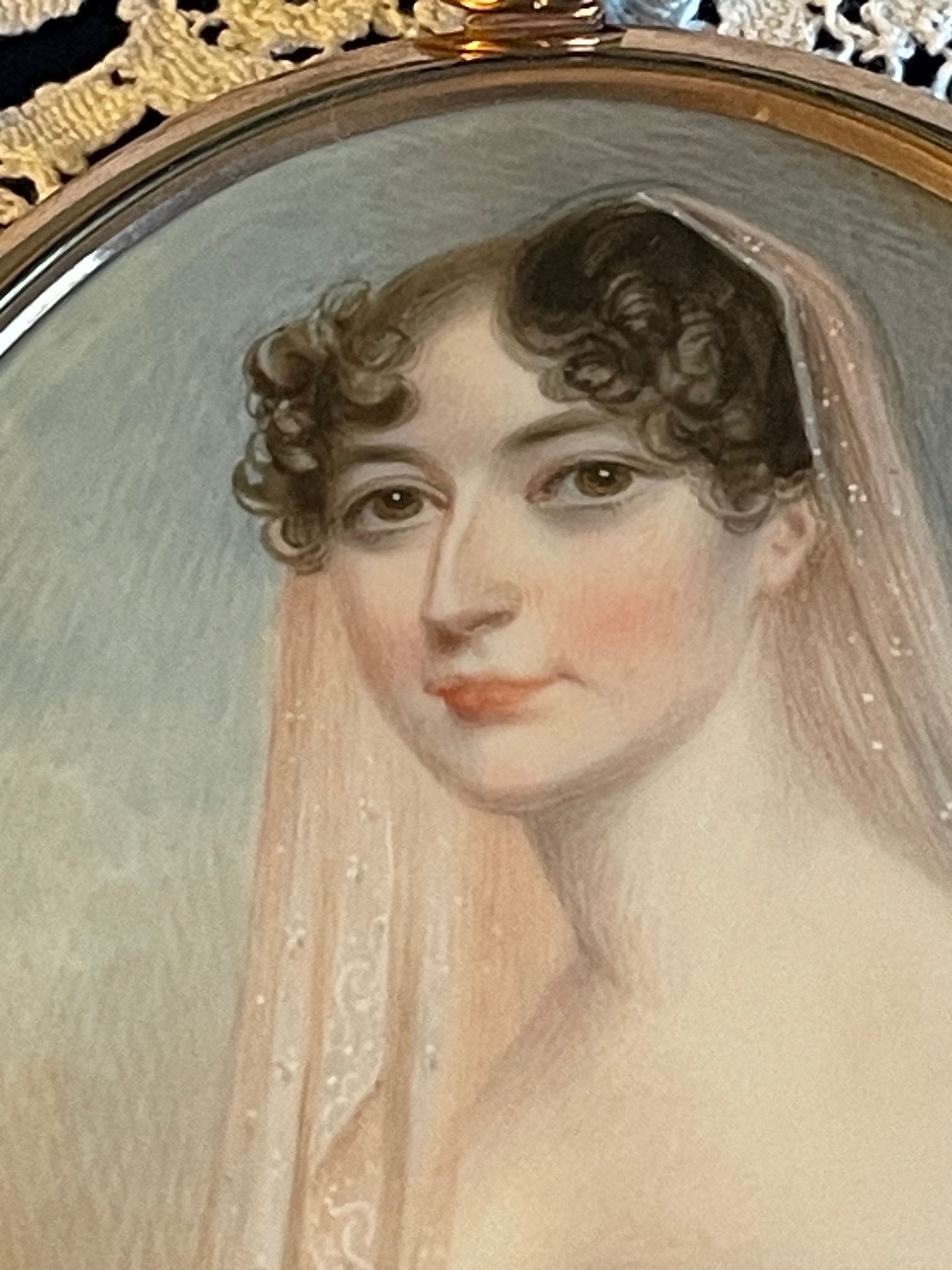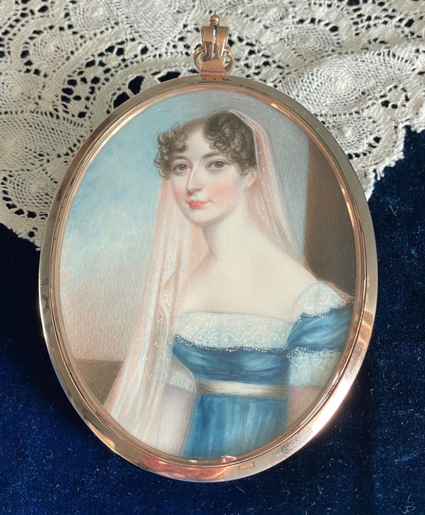 This elegant swan-necked young lady has soulful brown eyes and blushing cheeks. She is wearing a classical short-sleeved empire-line dress in cornflower blue trimmed with lace and tied with a narrow ribbon on the high waist. Her hair is fashionably curled and topped with a long pale pink lace veil headdress that suggests this may be the young lady’s marriage portrait.