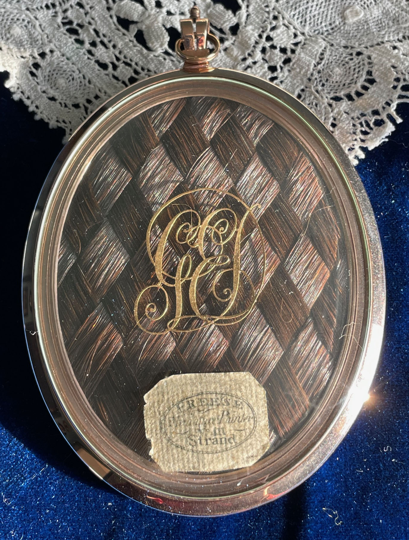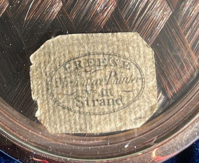 The generously-sized portrait is presented in the original gold plated frame that is glazed reverse to show the initials GED in monogram laid on finely plaited brown hair. The artist’s rare trade label from his studio at No. 411 Strand is affixed reverse.