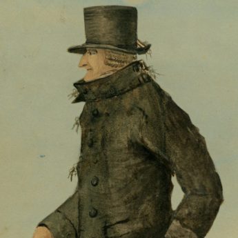 This fabulous watercolour portrait captures the real essence and character of this elderly gentleman as he strides along, stick in hand, in his top hat, an overcoat tied with string, striped breeches and spats. Thanks to an extensive inscription on the reverse of the painting, the old man’s story has been carefully preserved.