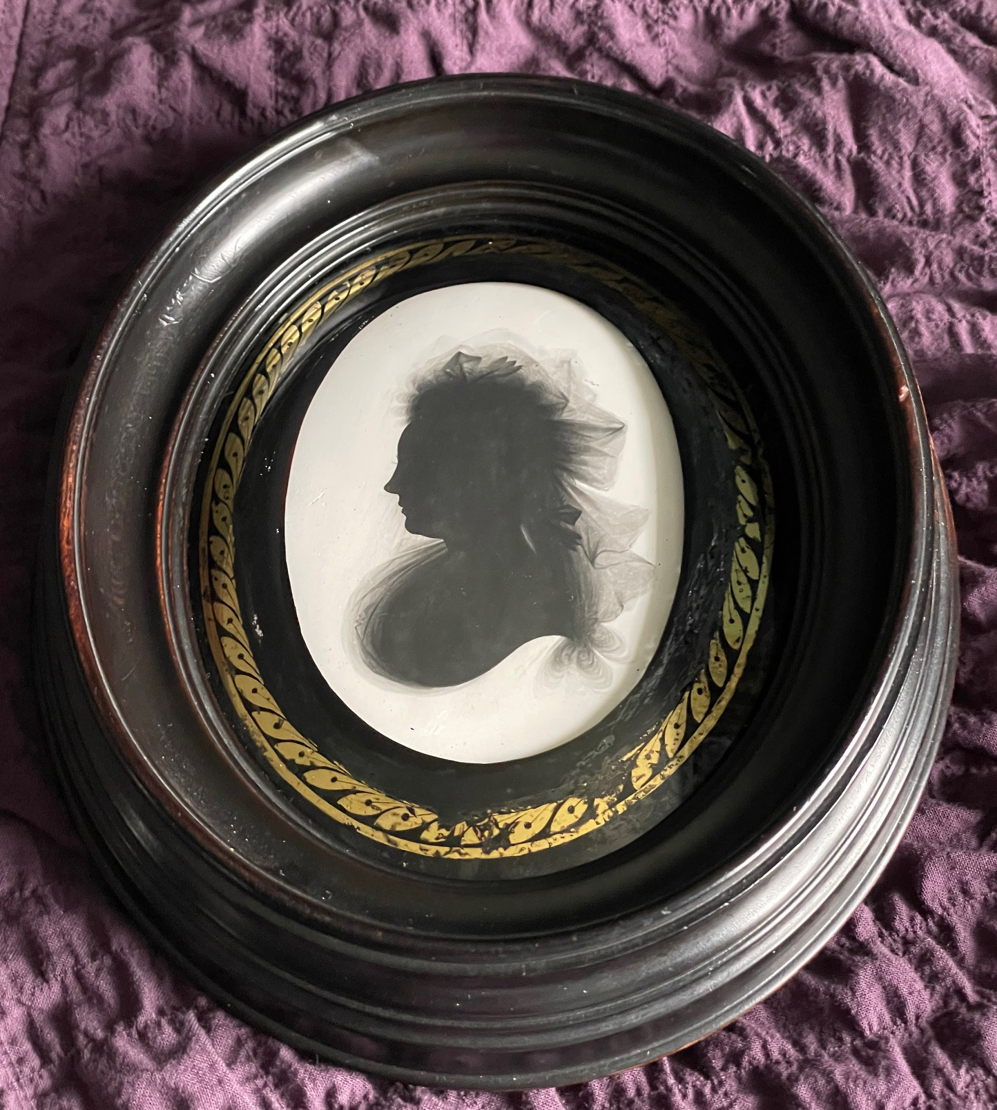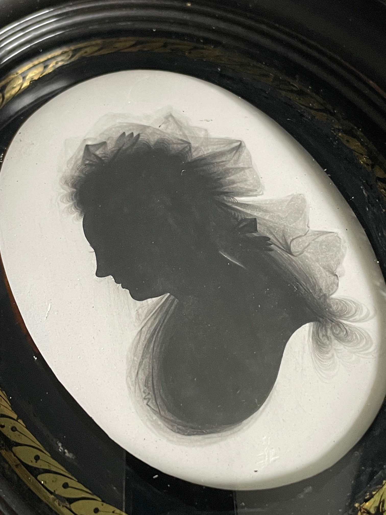 This ‘shade’ is typical of Miers’ best work. Painted on plaster, the silhouette is set in the original turned wood frame with a verre églomisé surround. The silhouette is in fine condition; the decorative border has small losses and some rubbing.